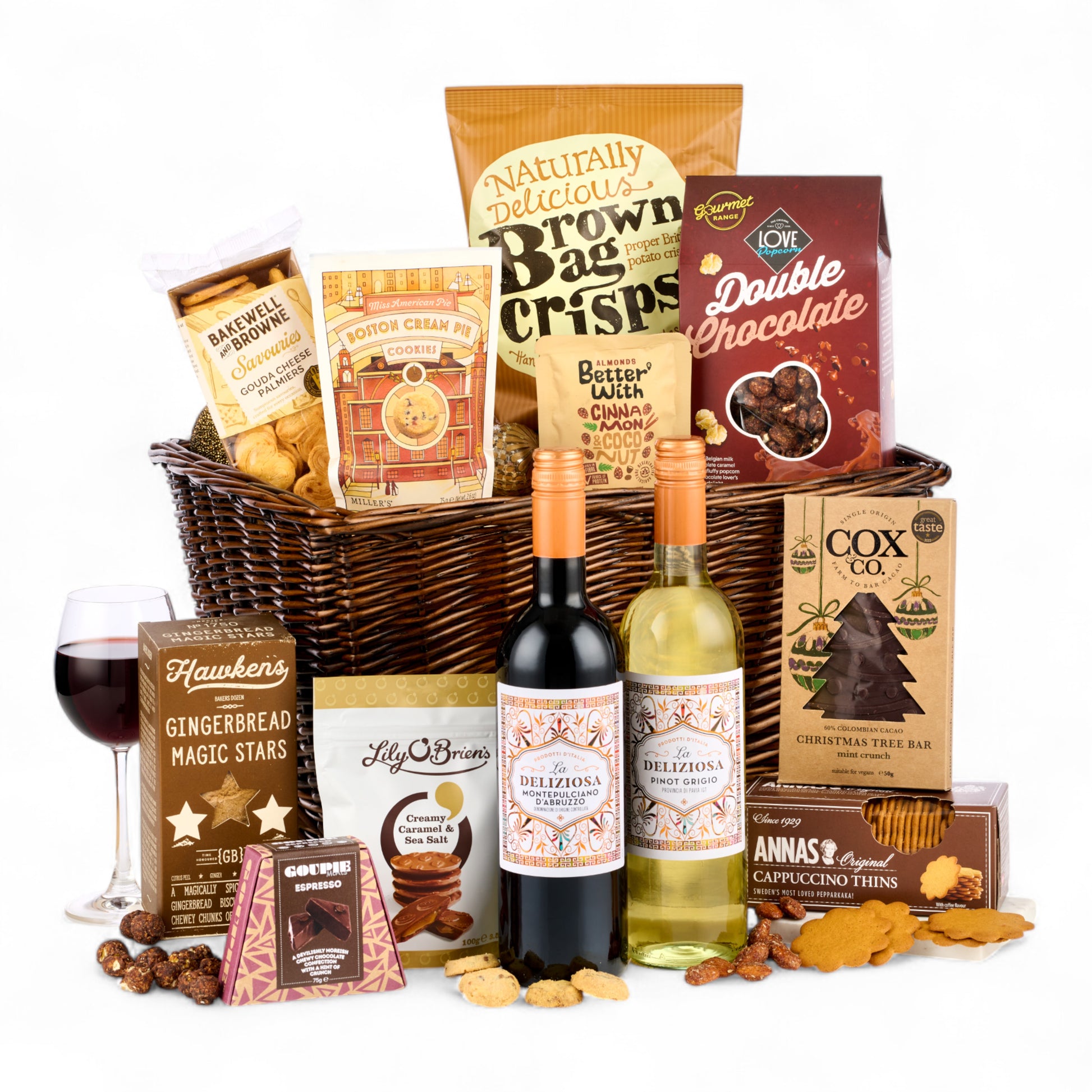La Deliziosa Montepulciano D'Abruzzo 75cl La Deliziosa Pinot Grigio 75cl Anna's Cappuccino Thins 150g Brown Bag Lightly Salted Crisps 150g Cox & Co Christmas Tree Bar Mint Crunch 50g Lily O'Brien's Creamy Caramel & Sea Salt 100g Better With Cinnamon & Coconut Almonds 30g Goupie Espresso Mini 75g Love Popcorn Double Chocolate 100g Hawkens Gingerbread Magic Stars 125g Miss American Pie Boston Cream Pie 75g Bakewell and Browne Savouries Gouda Palmiers 80g Packed in a Wicker TrayDelivery & Returns