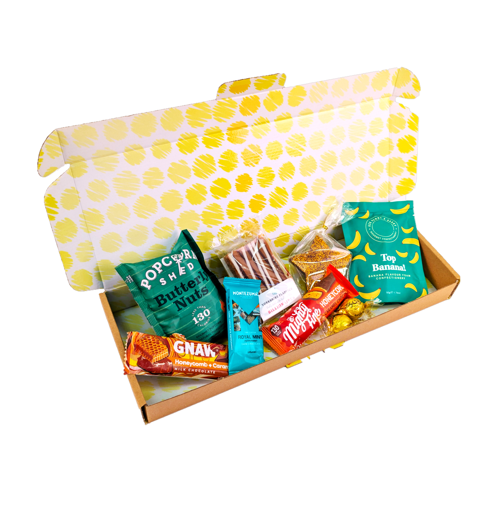 Inside, there are fun Ask Mummy & Daddy Top Banana Gummies, a rich Yorkshire Billionaires Flapjack, and the golden crunch of a Mighty Fine Salted Caramel Honeycomb Bar. Chocolate lovers will enjoy the smoothness of a Gnaw Honeycomb & Caramel Chocolate Bar, alongside silky Lily O’Brien’s Salted Caramel Chocolates.